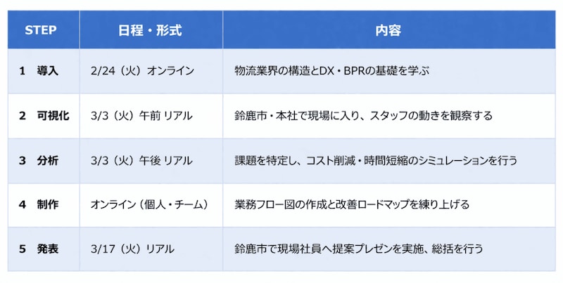 プログラムは2026年2月24日(火)から3月17日(火)の約1ヶ月間、三重県鈴鹿市およびオンラインで実施されました。 全日程は以下のスケジュールの通りです。