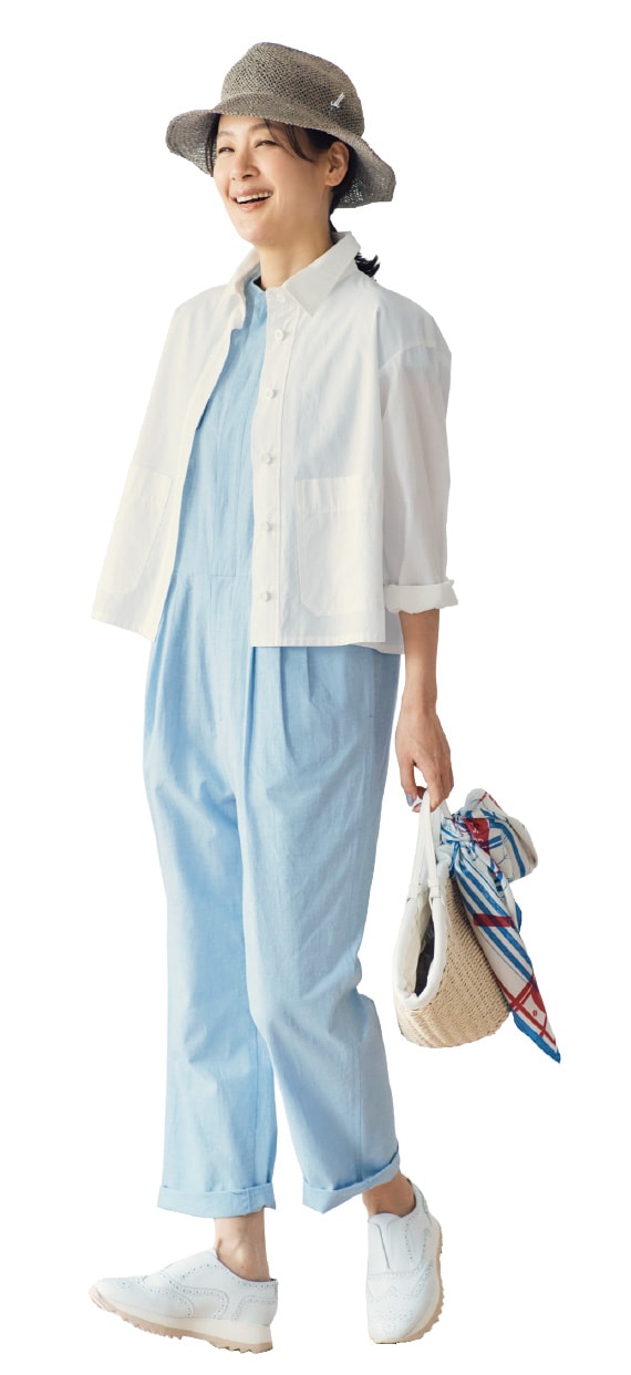 ジャケット¥30,800/レキップ、オールインワン¥42,900/ティッカ、帽子¥33,000/ミュールバウアー(アッシュ・ペー・フランス)、かごバッグ¥14,300/ハリス(金万)、スカーフ¥22,000/マニプリ、シューズ¥46,200/プレインピープル(プレインピープル青山)