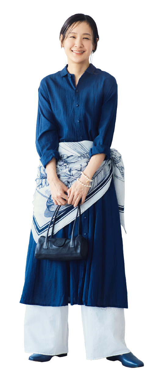 ストール¥15,400/レキップ、ワンピース¥57,300/パドカレ(パドカレ六本木)、パンツ¥53,900/エリテ(ケイエムディーファーム)、バッグ¥40,700/パドカレ(パドカレ六本木)、スリッポン¥42,900/ディヴィナ(金万)、ブレスレット(5本セット)¥19,800/アビステ