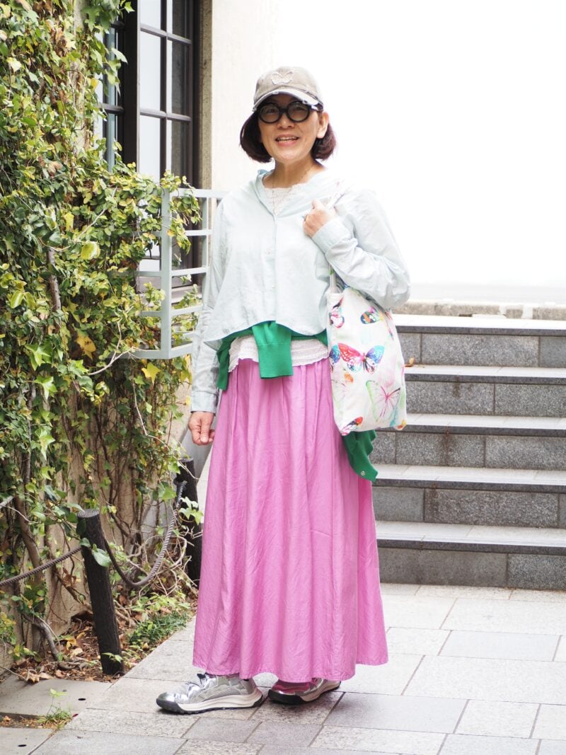 爽やかなミントグリーンのシャツに合わせたのは、発色の良いピンクのスカート。「きょうは友人とテーマカラーを決めてお出かけへ。ピンクをメインに、春らしい色をちりばめました」。ウエストに巻いたビビッドなグリーンのカーディガンは目線を上に持ってくるスタイルアップ効果も。