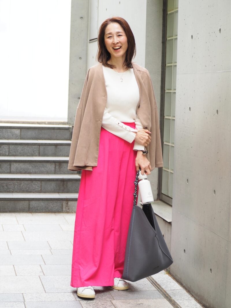 鮮やかなカラーがよく似合うYukoさん。この日は、上下ともにコストパフォーマンスに優れたファストファッションブランドを組み合わせ。「ビビッドな色でも、価格が抑えめだとチャレンジしやすいです」。クリーンな白を持ってくることでピンクを引き立てつつ、顔周りをパッと明るく見せる効果も。