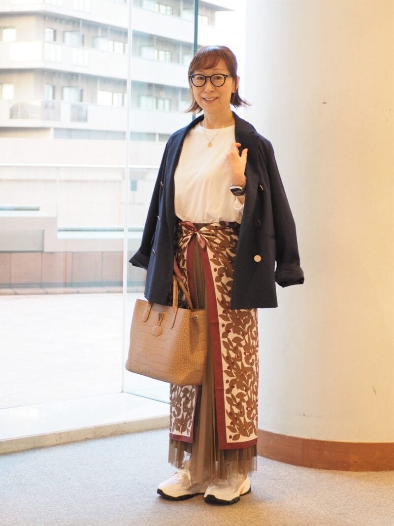 清潔感のある白Tシャツに紺のブレザーをオン。金ボタンがアクセントのダブルジャケットは、袖を通さず肩にかけて抜け感を。サテンとチュールのスカートに大判のスカーフをレイヤードするだけで、さらにおしゃれ度アップ!
