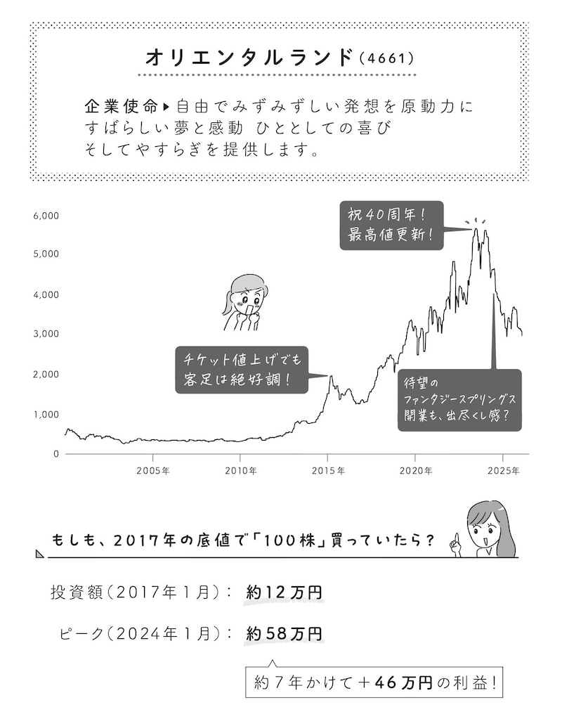 みんな大好きディズニーランドを運営する、「オリエンタルランド」。「ずっと大人気」のイメージが強いディズニーランドですが、実はこんなに株価が動いているんです!