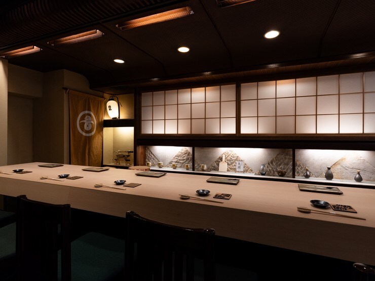 看板はないものの、福岡の聖地や銀座の名店を知る食通も通う、まさに隠れ家。4メートルの障子が広がる静かな空間にあるのは、檜のカウンター5席のみ。目の前で料理が仕上がっていく様子を眺めつつ、店主との会話も楽しむことができます。ネタやシャリとの相性を吟味して厳選された日本酒とともに、美酒佳肴に酔いしれてください。