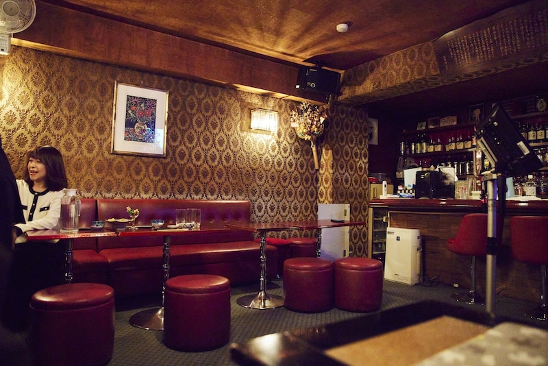 五十嵐さんいわく、一軒目の加悦が「ほっこり系」なら、こちらは「ディープ系」。路地を進んでいくと、いかにも「昭和レトロ」なビルに到着。階段を3階まで上り、重厚なドアを開ければ──赤いソファ、ベロア調の壁。