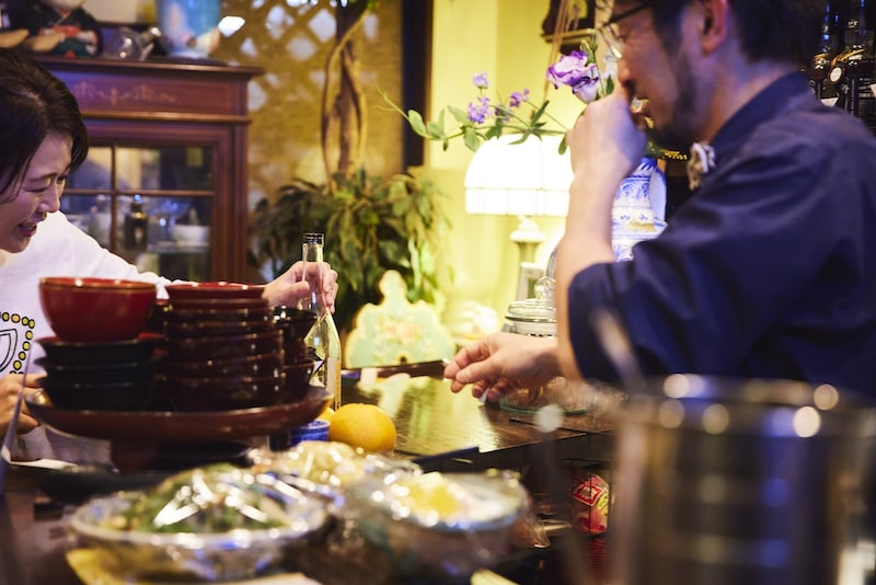 カウンター8席の店内に、整然と並ぶ酒瓶。品よく出番を待つ漆器や、長崎との縁を感じるインテリアたち。その一つひとつが、店主の個性をさりげなくにじませているようだ。