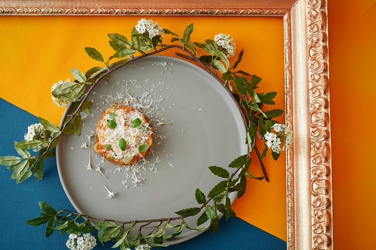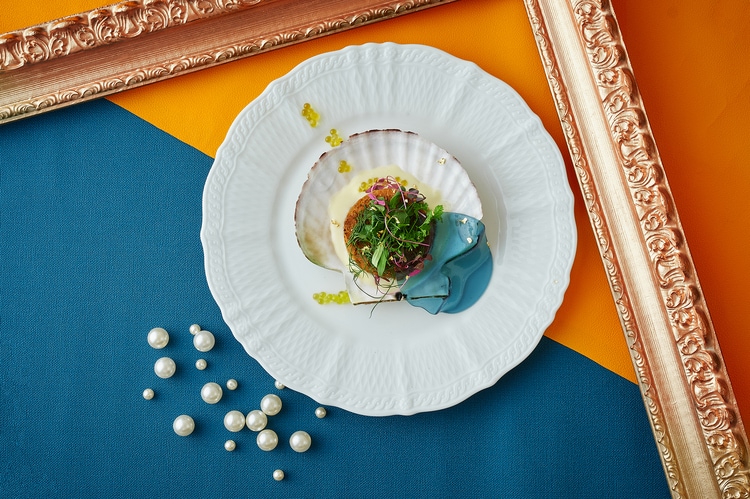 ボッティチェリ作「ヴィーナスの誕生」より温前菜『リボッリータ イン パデッラ』。絵画でも印象的な貝殻が小皿となったこちらの一品は、イタリアの郷土料理をアレンジしたものとなっています。海を思わせる上の青い部分はバターフライピーで作ったもの。周りにはキラキラとしたオリーブオイルの粒があしらわれています