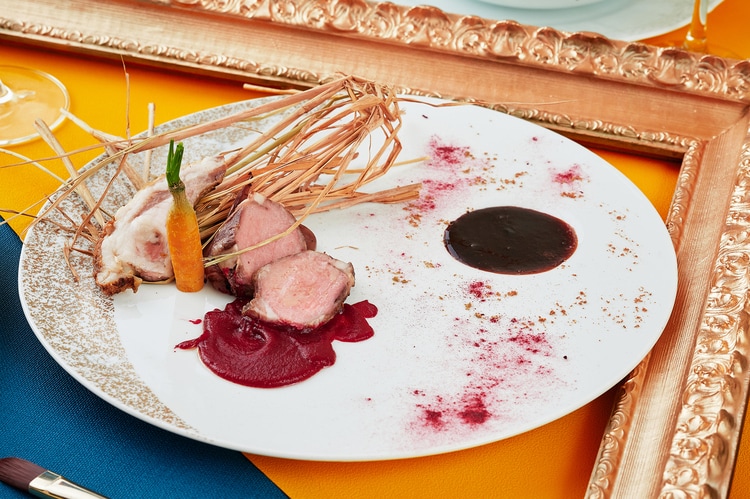 ヴェロネーゼ作「カナの婚礼」より肉料理『仔羊のロースト 藁の香り』。仔羊は焼いた後に藁で燻しており、香りとともに楽しみます。ワインのソースとビーツのピューレを添えて