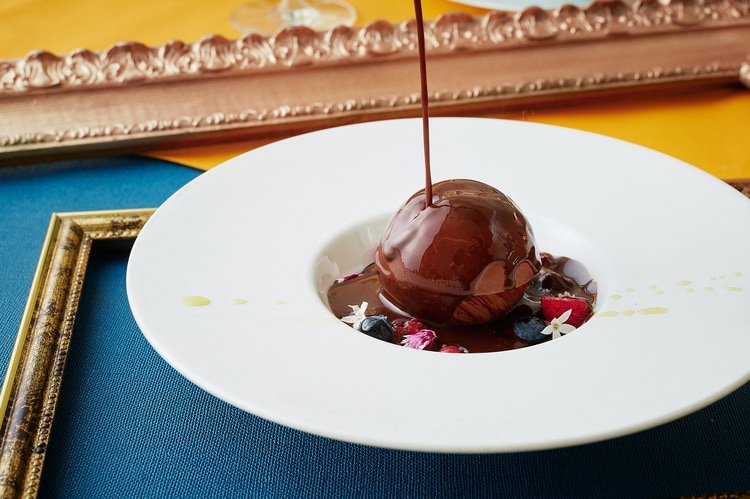 ミュシャ作「ショコラ・イデアル」よりデザート『エスフェラ・デ・チョコラテ』。温かなチョコレートソースを回しかけると、その中には…⁉ 仕掛けも楽しいラストのデザートです