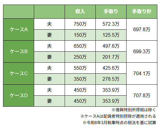 試算すると、夫に所得が集中しているケースよりも、夫婦の収入が均等に近いケースの方が手取りは多くなります。夫婦の収入が同額となるケースが最高額になり、その差は年間で約10万円です。