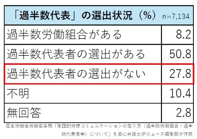 「過半数代表者の選出がない」と回答した事業所は27.8%で、「不明」10.4%、「無回答」2.8%とあわせると4割に上る。