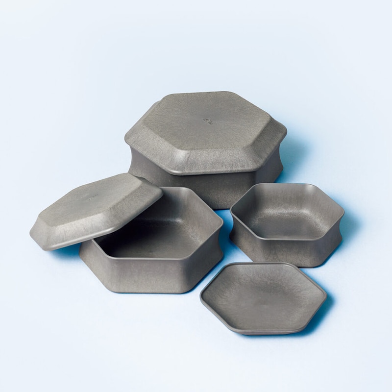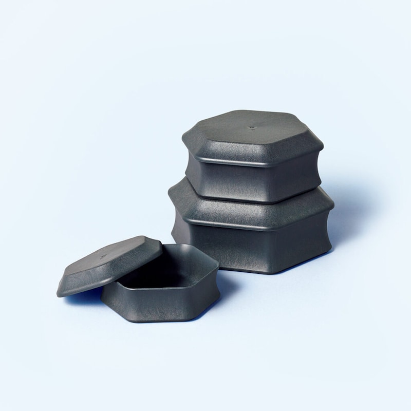 ガラスと樹脂を組み合わせ、落としても割れにくい独自素材を使った〈ARAS〉。電子レンジに対応したヒートコレクションより、六角の深鉢と平皿の大中小セット。「一見、陶器のようにも見えるので手に取って驚きました。割れない上に、食洗機まで使えるというのはかなり安心感があります。何より、サイズ感と六角というフォルムが絶妙。スタッキングもしやすく、平皿は深鉢の蓋としても便利だし、縁にわずかな立ち上がりがあるので、料理がこぼれにくいんです。必要以上に軽すぎず、程よい重さがあるのも使い勝手がいい。和食、洋食、エスニック……どんな料理にも映えますね」