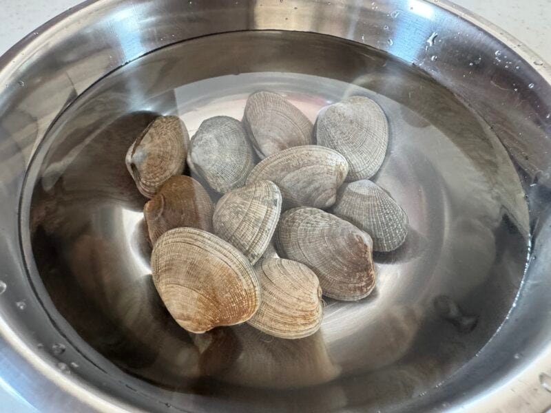 あさりは3%程度の塩水(分量外)にひたし、アルミホイルを被せます。2〜3時間ほど置いて砂を吐かせます。使う前に軽くこすり洗いしましょう。