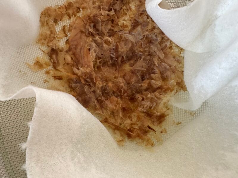 ③ 鰹節が沈んできたら、厚手のキッチンペーパーでこして出汁をひく。