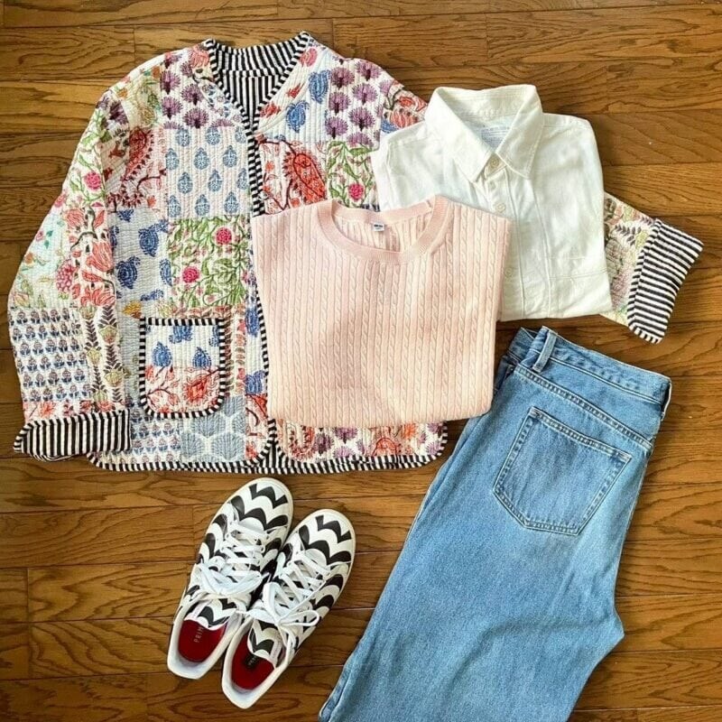 今回の旅のコーデは、デニム1本と長袖服2着という最小限のコーデにプラスして、華やかで気分が弾む「カンタキルトのジャケット」を羽織って行きました。