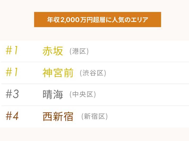 一方で、年収2,000万円を超す「真の富裕層」たちは、まったく異なる選球眼を持っている。彼らが選ぶ街の同率1位に輝いたのは「赤坂(港区)」と「神宮前(渋谷区)」である。