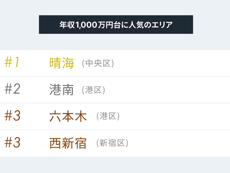 調査結果を読み解くと、現在の年収1,000万円台、そして2,000万円超の双方から手堅い支持を集めているのが「晴海(中央区)」と「西新宿(新宿区)」だ。
