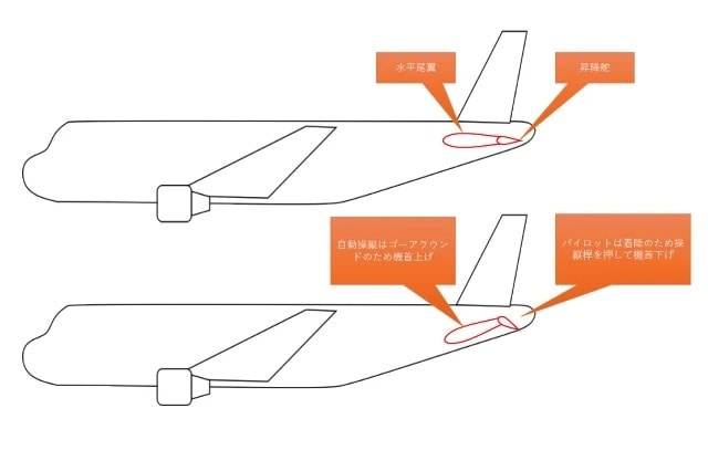 ところが自動操縦は「ゴーアラウンド」の指示のもと、水平尾翼を機首上げの方向に動かしていく。副操縦士の意図と自動操縦が真っ向から対立し、昇降舵と水平尾翼が「くの字」に開き、機体は極めて不安定な状態に陥った(図1)。