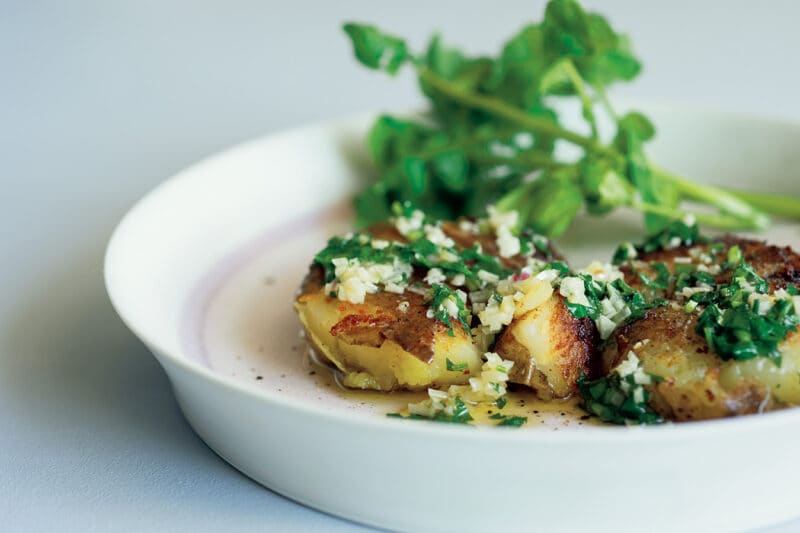 3. フライパンにオリーブオイル大さじ1を足し、にんにくを炒める。塩、パセリ、にごり酢を入れ、煮立ったら2 の上にかける。こしょうをふり、好みでクレソンを添える。