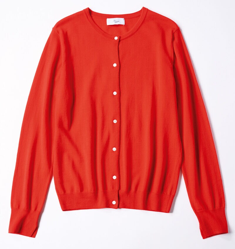 発色のいい赤カーデを肩がけにして華やぎと抜け感を演出。