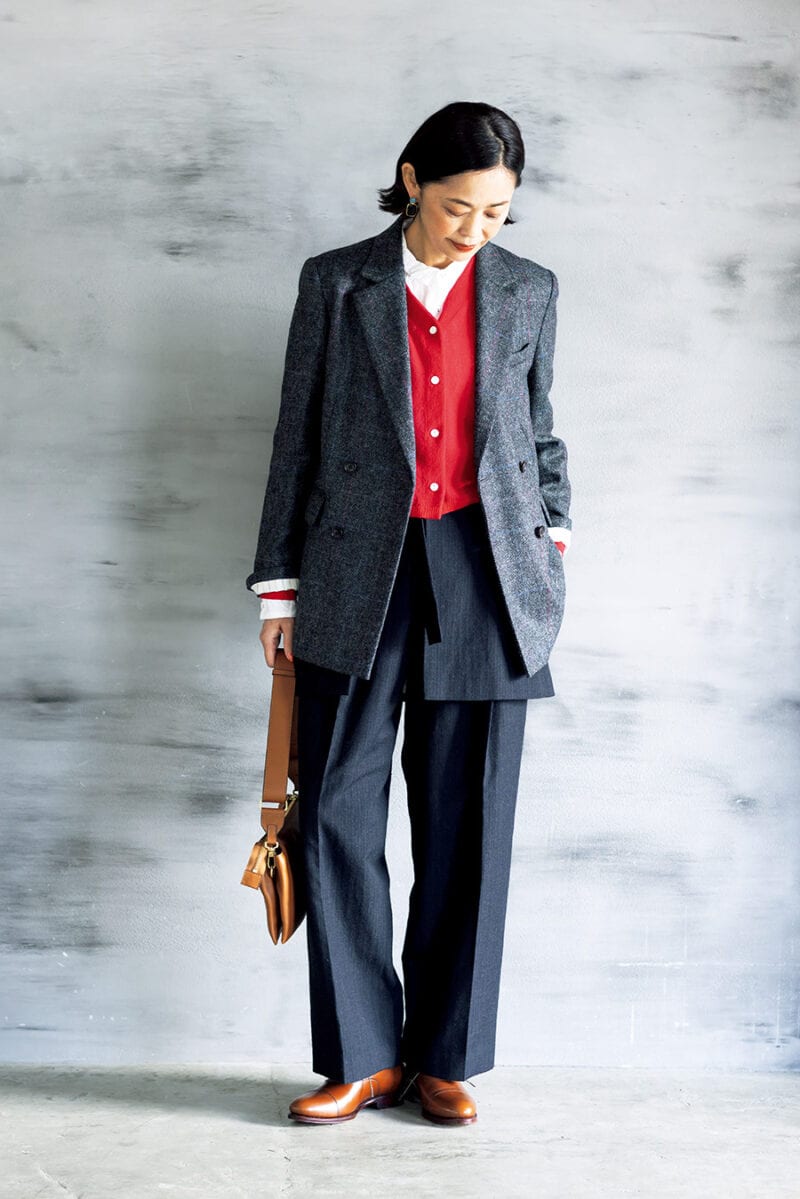 メンズ調な色合わせに赤を効かせて女性らしく
