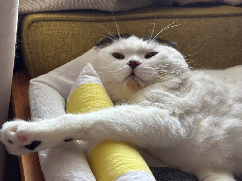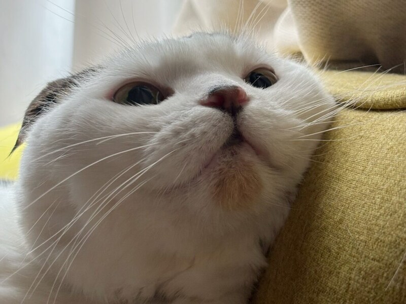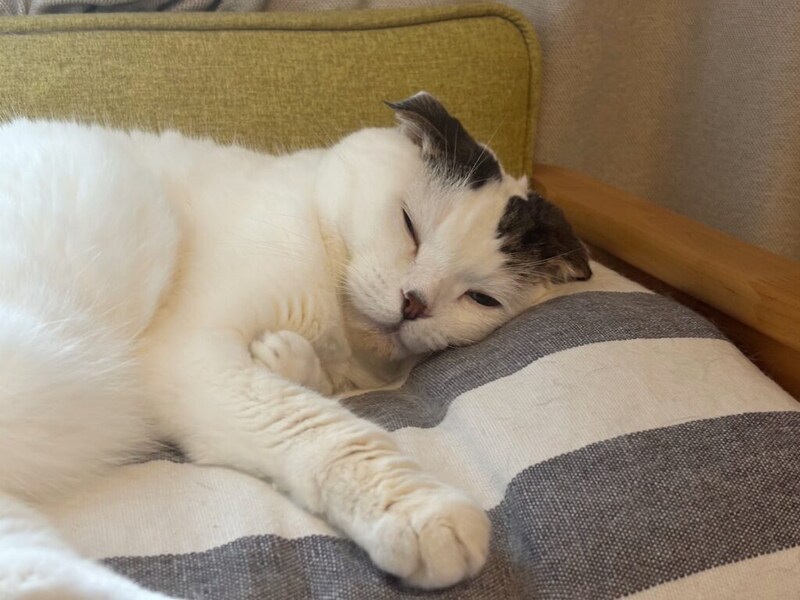 生まれは京都、育ちは大阪の6歳オス。いなほという名前は、飼い主が大好きなスピッツの曲名から。コーヒーこぼしちゃったみたいなアゴの茶色の斑点が、オレのチャームポイント。飼い主さんには、かなり用心深く繊細なタイプと言われてて、インターホンの音が鳴ると雲隠れし、ティッシュを抜く音にさえびっくりして跳び上がってしまうほど。本誌2021年7月号にて、わたなべとしふみさんによるいなほの紹介イラストを掲載しています。