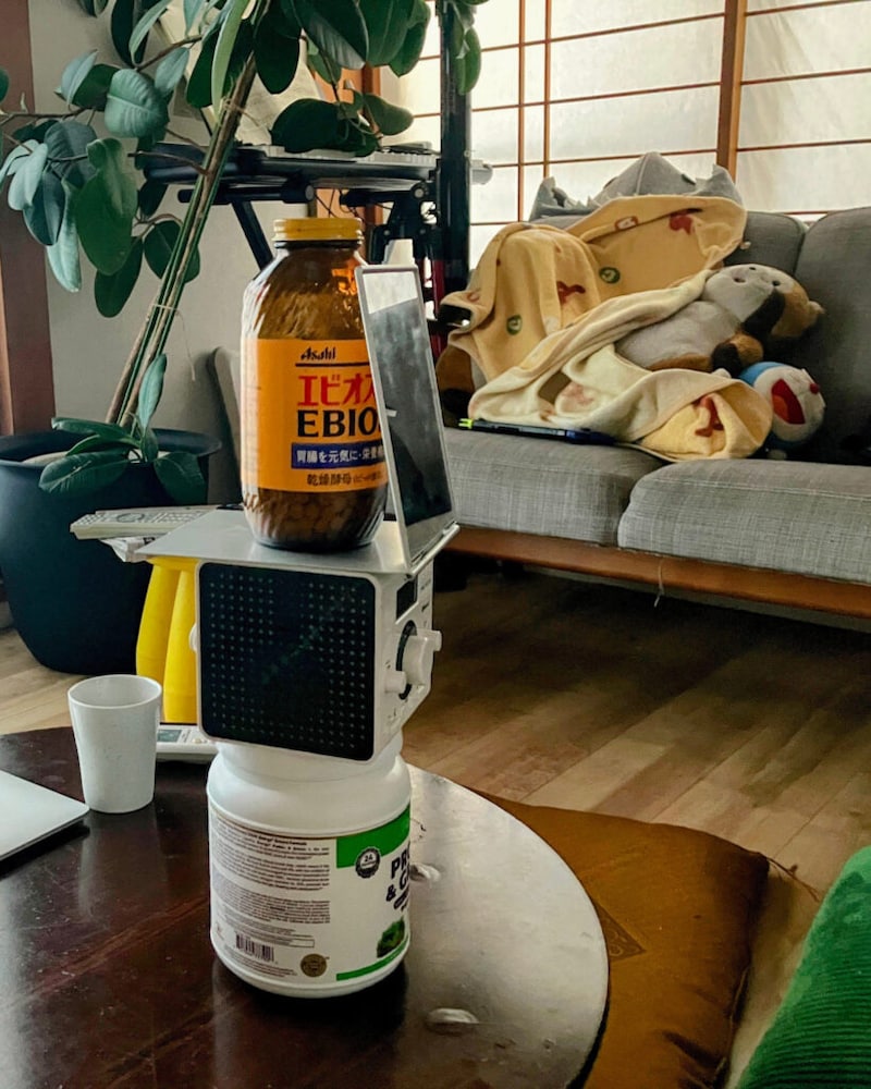 家族で使うちゃぶ台の上に、青汁の大きなボトルを置き、そこに、娘が中学校の技術科の授業で作った四角いラジオを乗せる。その上に開閉式の鏡を立てて、整腸剤の大きな瓶で固定する。こうすると、ちょうど座った時に、ぴったり顔の高さになる。