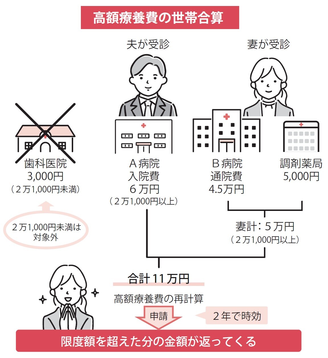 このような場合に、1か所で2万1,000円以上(70歳未満の場合)かかっていたら、高額療養費の世帯合算の手続きを行うことで、再計算され医療費が戻ってくる可能性があります。