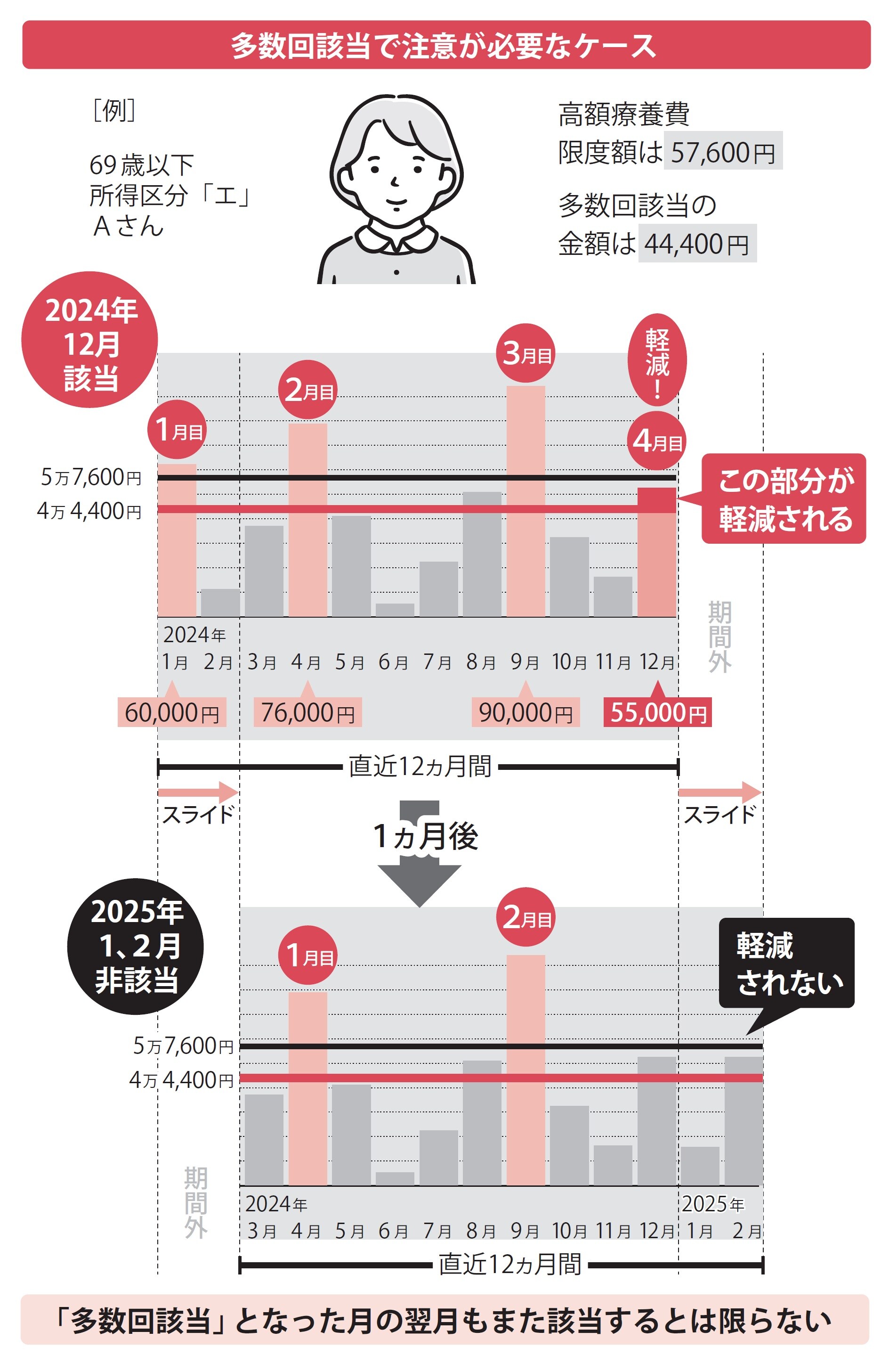 直近12ヵ月以内に3回高額療養費に達していたら、4回目以降は約半額(収入区分によっては半額ではありません。図表8~9を参照)になります。