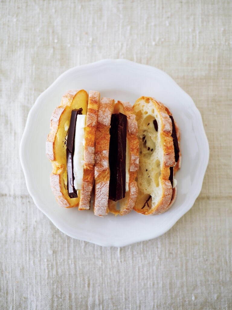 深煎りでも浅煎りでも豆の種類は何でもOK。バターとチョコレートという最強コンビが、コーヒーの苦味や酸味と絶妙にマッチする。バゲットやチャバタなどのプレーンなパンを小さめに切り分けて、冷やした無塩バターと、カカオ含有率が高いビターチョコレートを挟むだけのサンドイッチ。挟む量はお好みだが、たっぷりと入れたほうがおいしい。作り方がシンプルな分、バターとチョコレートの質にこだわると上等な味になる。
