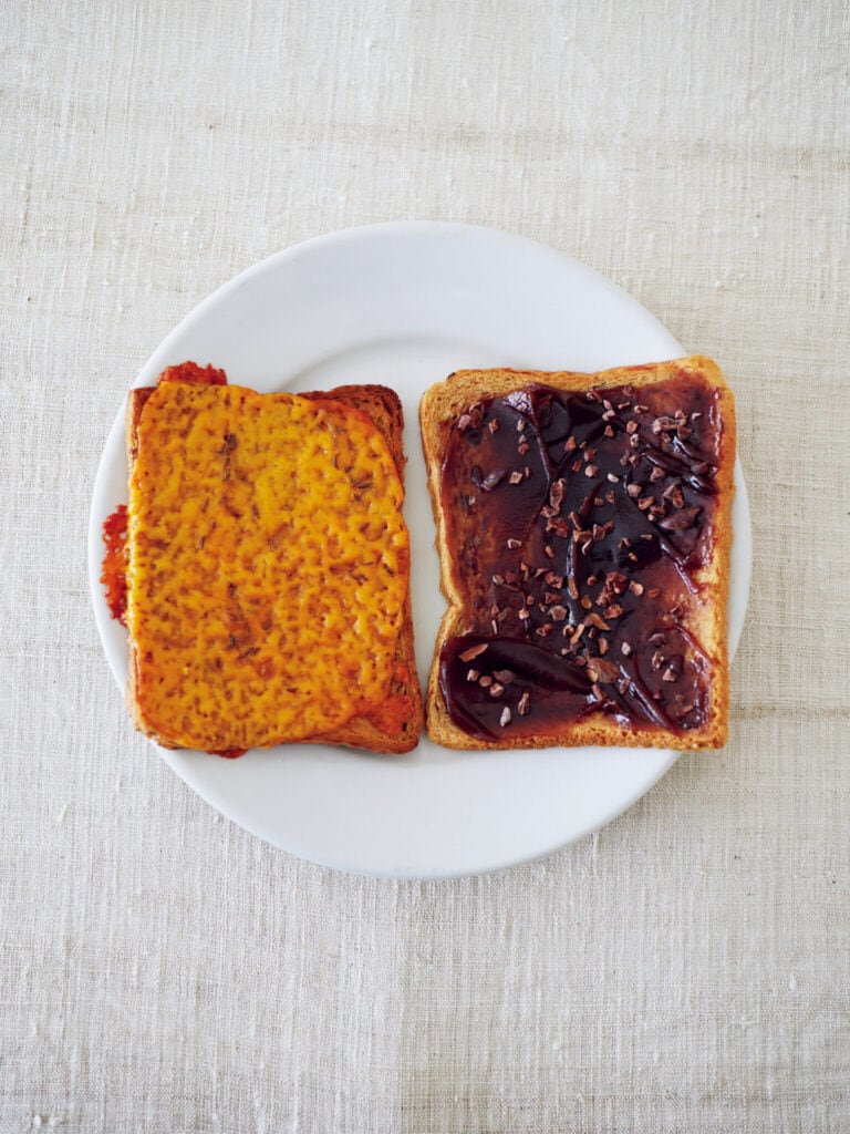 軽食にもなるトーストは、たっぷりのコーヒーと。左のチーズトーストは、薄切りパン(サンドイッチ用のライ麦か全粒粉パン)を軽く焼き、チェダーチーズを散らす。そこにキャラウェイシードをふってさらにトースト。チーズがしっかり溶けて香ばしく焼けたら出来上がり。右のあんことチョコのトーストは、水気を飛ばす程度に焼いた薄切りパンにこしあんを塗り、カカオニブを散らす。『TORAYA CAFÉ』のあんペーストを使用。