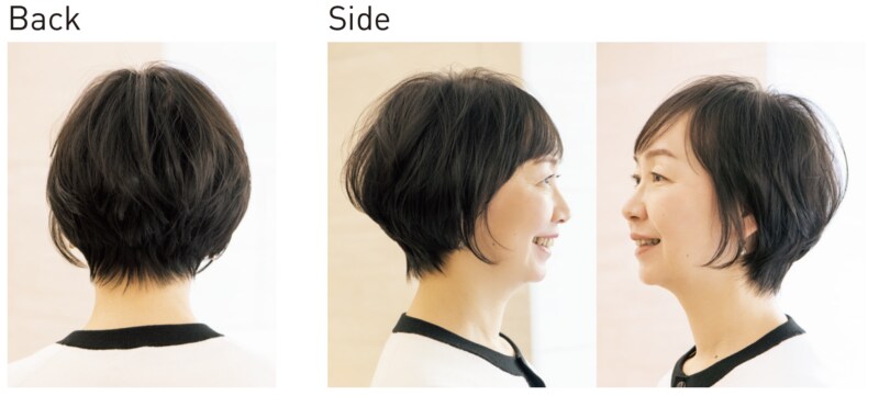 「分け目が目立たないよう、トップにふんわりとしたボリュームをつくります。さらに額を出し過ぎないように前髪をつくり、ひし形シルエットのショートボブに。目線がボリュームのあるサイドと頭頂部にいくため、小顔効果も抜群です」