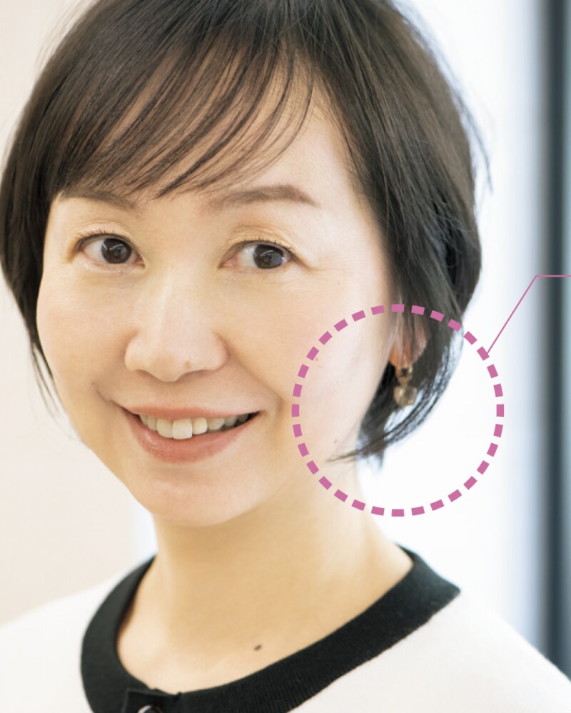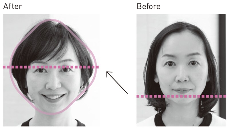 輪郭を見え隠れさせることで、丸顔をすっきり見せつつ、卵型のようなシルエットに補正。