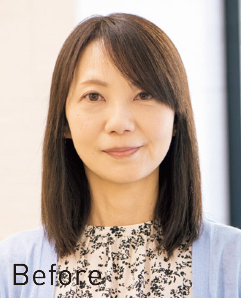 「髪型のシルエットが縦長になっていることで、骨格の面長感を強調しています。タイトなスタイルは避け、シルエットを横に広げて、縦長な印象をやわらげて。今回は、毛先に内巻きのカール感をプラスして、サイドにふくらみが出るように仕上げています」(安斎さん)