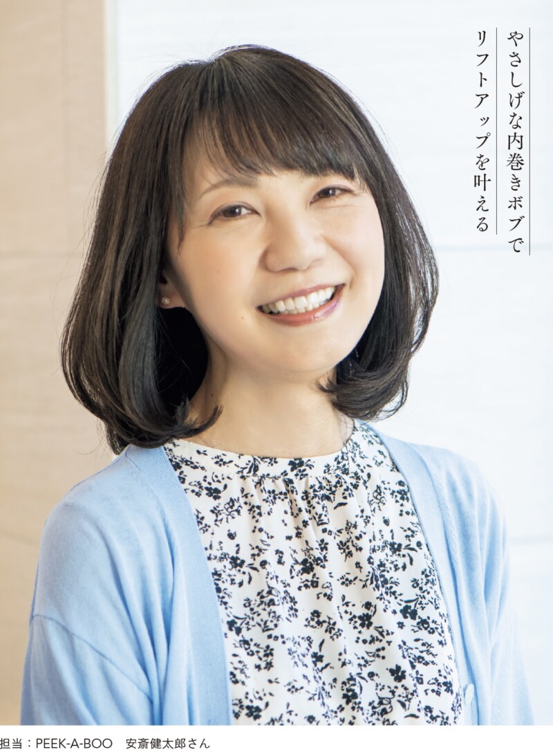 「髪型のシルエットが縦長になっていることで、骨格の面長感を強調しています。タイトなスタイルは避け、シルエットを横に広げて、縦長な印象をやわらげて。今回は、毛先に内巻きのカール感をプラスして、サイドにふくらみが出るように仕上げています」(安斎さん)