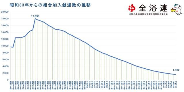 とはいえ、前述したように、銭湯の数は1968年以来、減少の一途をたどっている。平成元年判決が出された1989年(1万689軒)と比べると、今年の時点で1562軒と約7分の1にまで減っている。