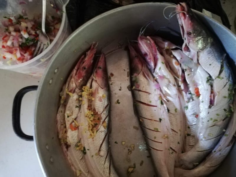 内臓を取り除き、ニンニクと玉ねぎを刻み、レモン、塩、辛くない唐辛子を混ぜたもの(これらを一部とっておく)をお腹に詰めて、バナナの葉でクルクル巻いて炭火焼きにします。そして焼きあがった魚に、残りの具を生のままトッピング。