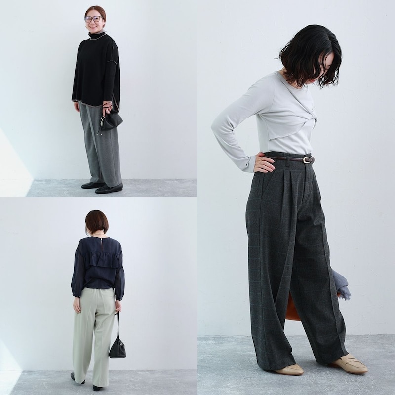 ワイドパンツ好きでお馴染み!?スタッフ3名が試着しています。ぜひ、ゆっくりとご覧になってくださいね。
