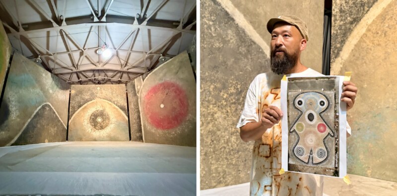 本島市民センターの横にある旧本島中学校体育館では、コタケマンさんの手がける巨大な絵画作品などが《うみのえまつり》と題して展示されています。