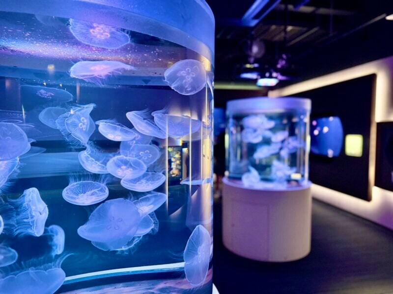 私のお気に入りは、クラゲの展示エリア。ぽわぽわ〜っと泳ぐクラゲたちを美しくライティングした没入感のある空間です。