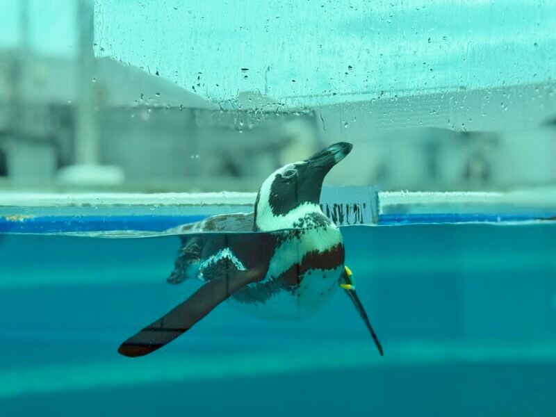 屋外には「水遊ゾーン」も。私が近づいてみたら、向こうも近づいてきたペンギン。しばらく見つめ合ってしまいました。