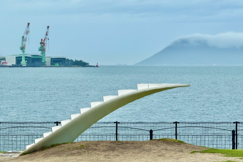 宇多津のランドマーク・四国水族館からほど近い海辺ではアクリル製の立体作品《色のない翼の彼方》ごしに瀬戸内の島なみを一望。2022年のUBEビエンナーレ(現代日本彫刻展)で大賞を受賞した西澤利高さんの作品です。