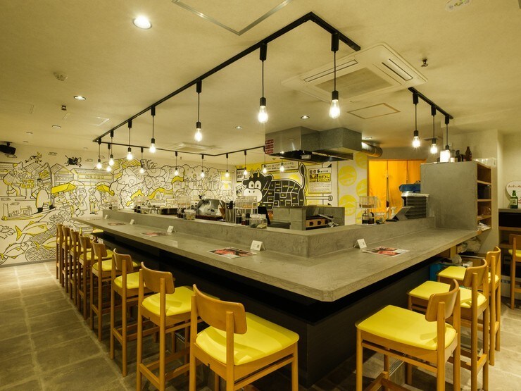 カウンター席のみの店内はペンダントライトが印象的なオシャレで明るい雰囲気です。店舗の入口へ続くビルの階段部分や店内の壁面には、金沢や能登を表現したポップで楽しいイラストがいっぱい。店のコンセプトが「お肉を存分に楽しめるミートパーク」だけあって、ワクワクする気持ちにさせてくれる内装です。メニューは売り切れ次第終了になるので、早めの来店がベターです。
