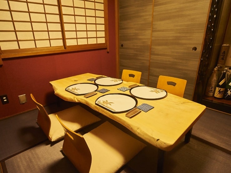 有名デザイナーが手掛けた店内。檜を使ったカウンターと和室の一枚板は、店主自らが選んだものだそう。上質な雰囲気の中でゆったりと食事ができる空間です。北陸の地酒をはじめ、全国の日本酒が60種類ほどそろっており、料理に合う日本酒を利酒師にセレクトしてもらうことも可能。フードアレルギーや苦手な食材の相談もできるので、大切な人との特別な時間を過ごしたいときにも安心して立ち寄れる一軒です。