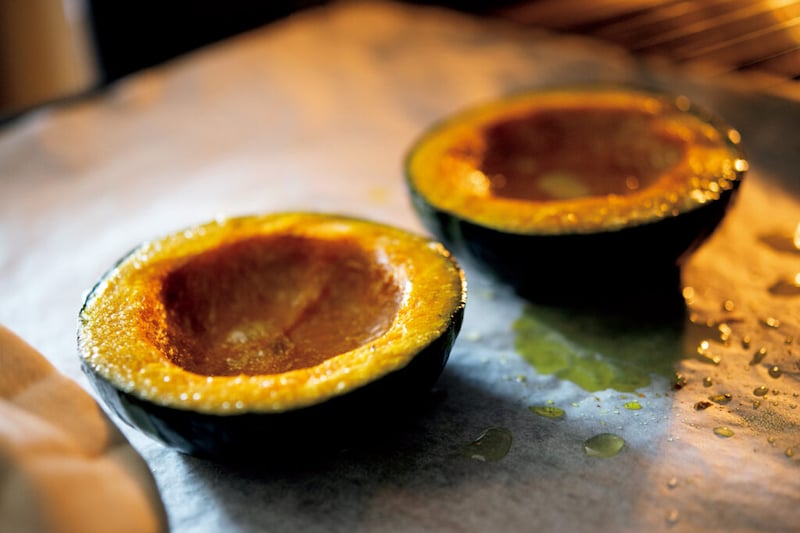1.坊ちゃんカボチャは横半分に切り、種を取り除く。オリーブオイルをまわしかけ、200℃に温めたオーブンで40~50分じっくり焼く。