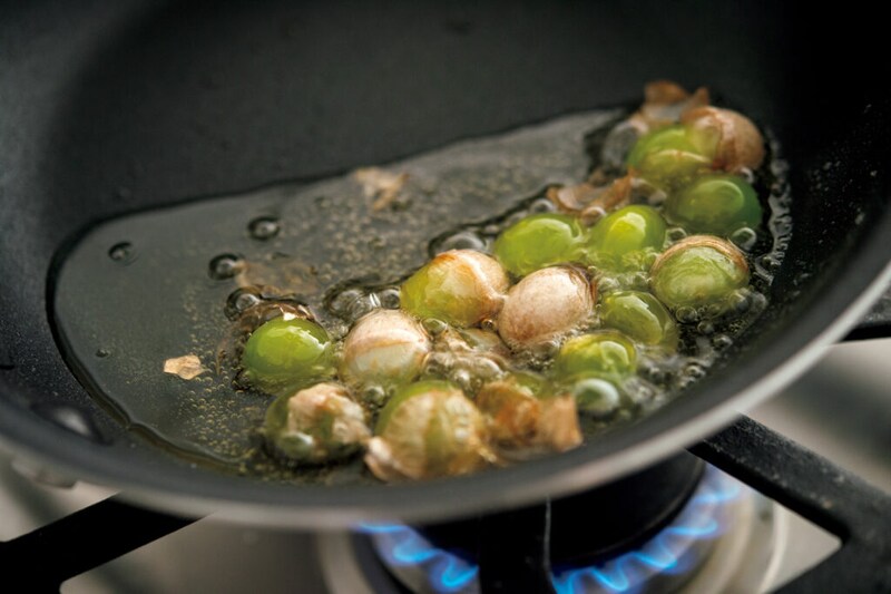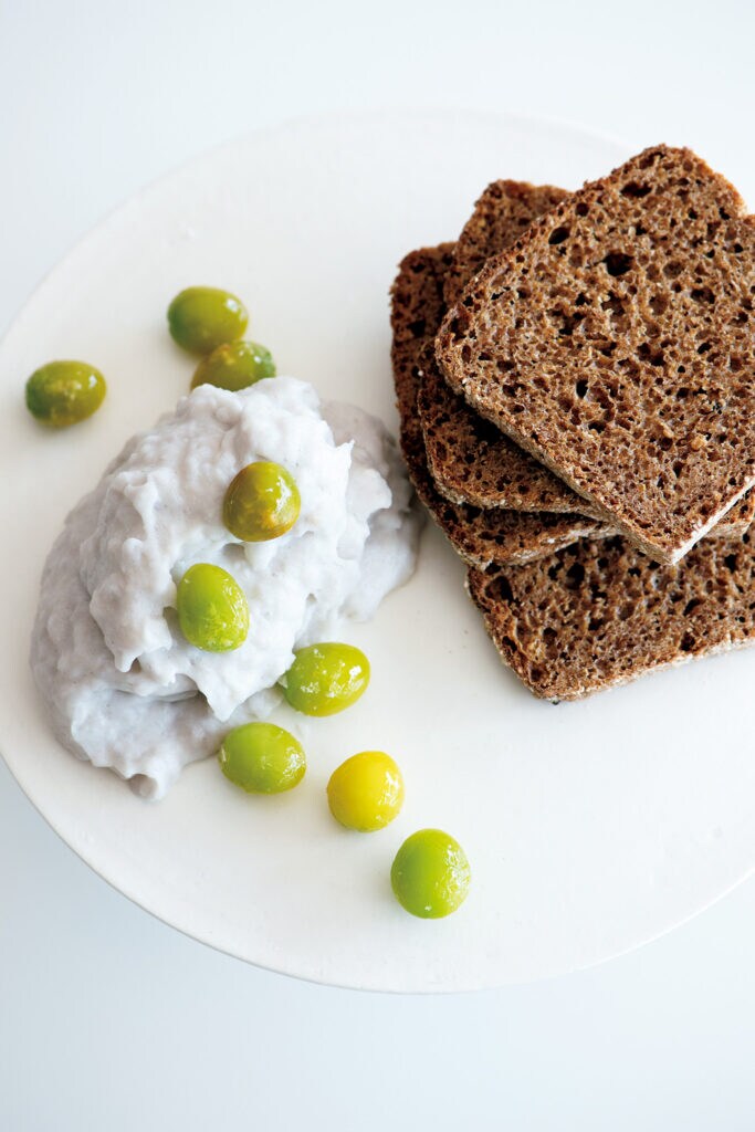 3.水分が少なくなったら、火を止めマッシャーか麺棒でつぶし、塩をふって、再び弱火にかけながら木べらなどでなめらかになるようによく混ぜる。素揚げした銀杏、トーストした黒パンとともに供する。
