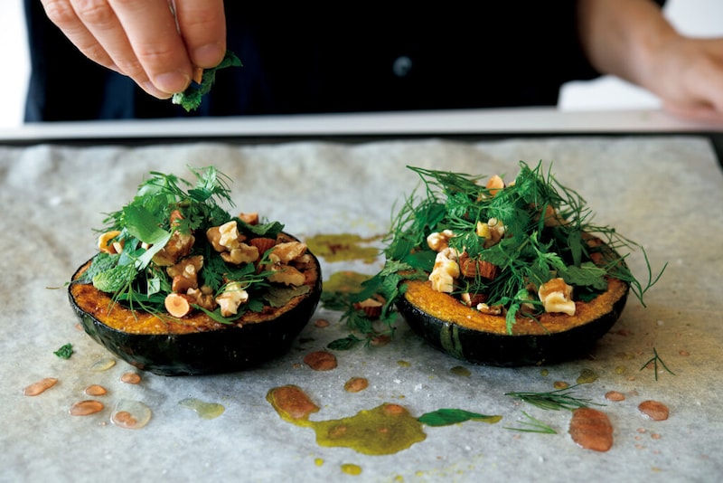3.焼き上がったカボチャに赤ワインビネガー、粗塩をかけ、ハーブとナッツを合わせて盛る。