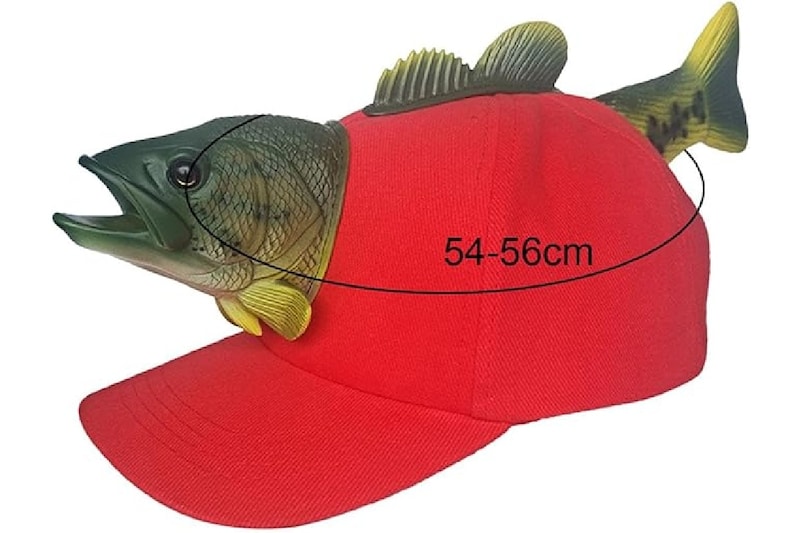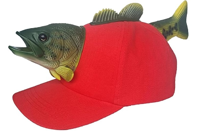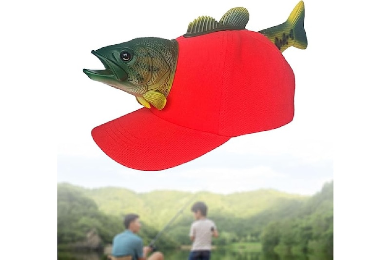 Amazonでみる鮮やかな赤いベースボールキャップに立体的な魚の造形が融合し、被るだけで周囲の視線をさらう存在感。
