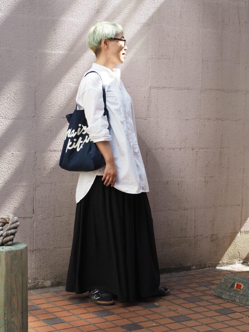 淡いグリーンのヘアカラー&ショートヘアが引き立つよう、コーディネートはいたってシンプルに。「マッキントッシュ」の白シャツと「ムジラボ」のロングスカートのゆるやかなシルエットがリラックス感を演出。シャツのピンタックや落ち感のある素材選びなど、随所にこだわりを感じるスタイリングです。