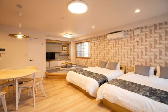 インバウンド日本観光の中心地、浅草にある物件です。こちらの物件は1Lで40㎡あり、6人のゲストを収容できます。ホテルで5人家族が宿泊すると、1人2万円として10万円かかります。一方、1泊5万円という価格設定なので、ホテルの半額で宿泊できます。